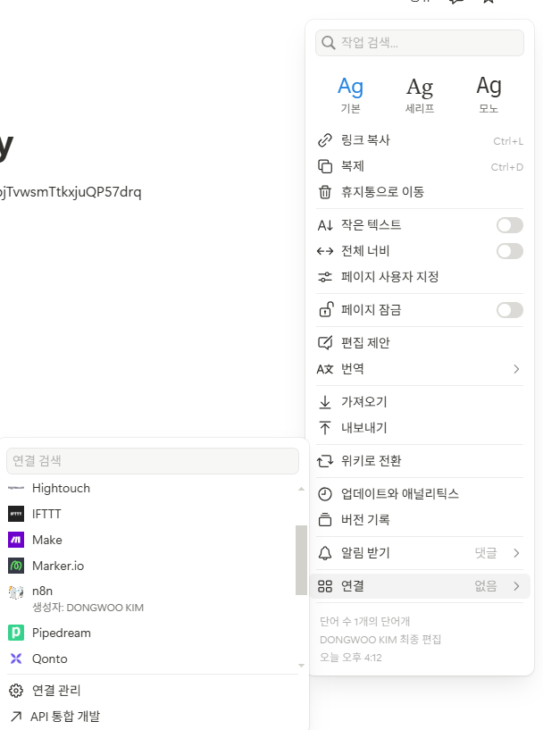 API 키를 발급받았더라도, 해당 키가 어떤 데이터베이스에 접근할 수 있는지 권한을 명시적으로 부여해야 한다. N8N으로 자동화할 데이터베이스 페이지에서 다음을 수행한다.