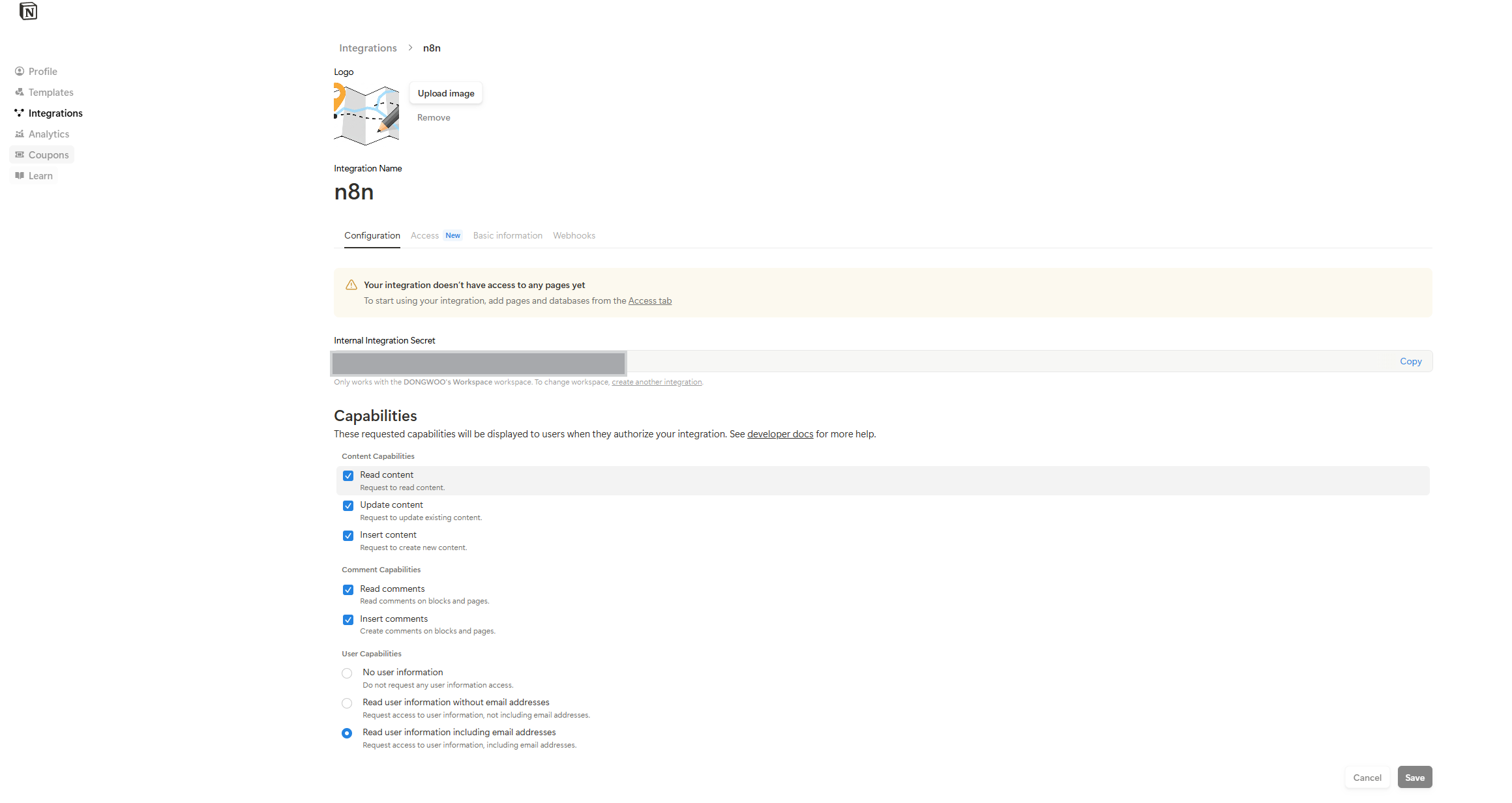 - 통합의 이름(예: "N8N 자동화")을 입력하고, 연결할 워크스페이스를 선택한 후 '제출' 버튼을 누른다.