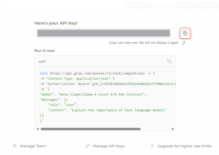 GroqCloud는 Llama, Mixtral, Gemma 등 다양한 오픈소스 LLM을 매우 빠른 속도로 제공하는 서비스이다. 무료로 충분한 양을 제공하므로, 개인 프로젝트나 프로토타이핑에 매우 유용하다. 먼저 Groq API 키를 발급받는다.