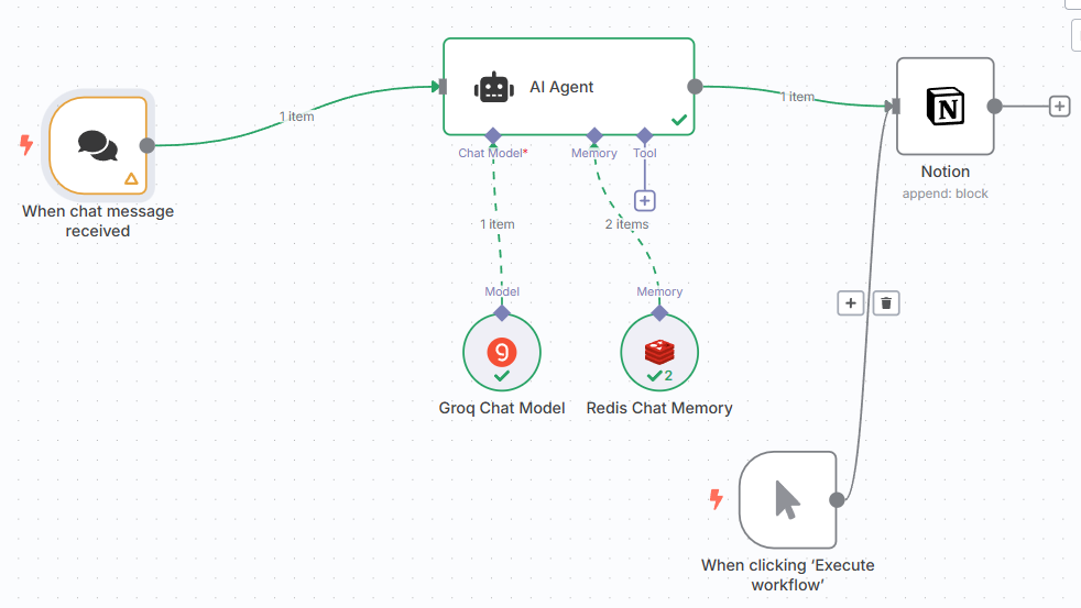 When chat message received → Redis Chat Memory → Groq Chat Model