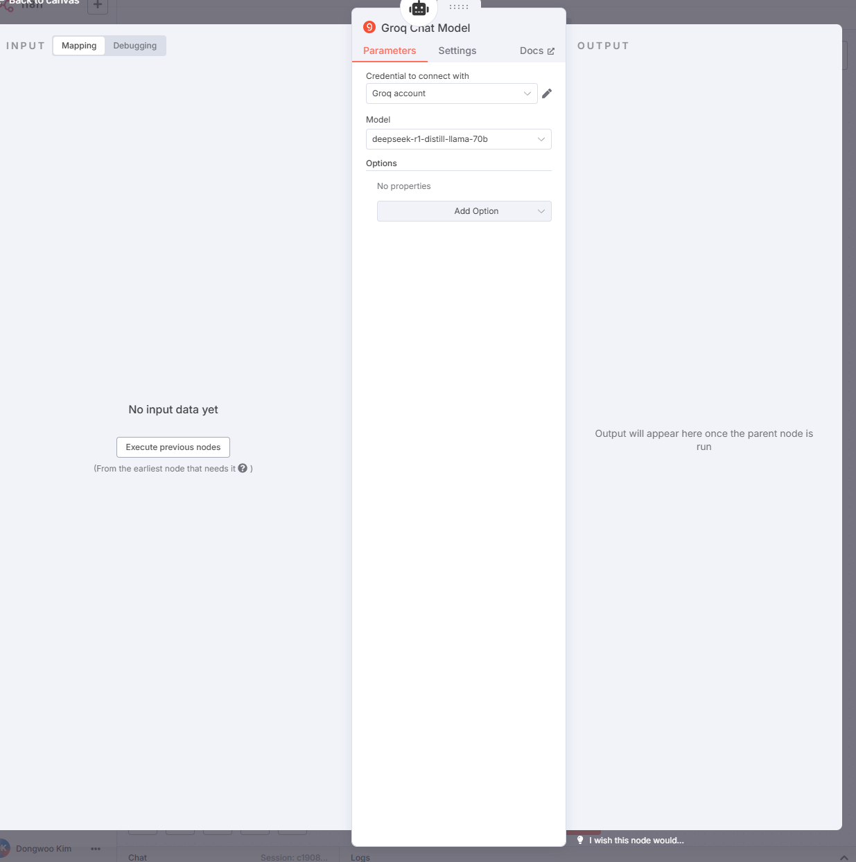 - n8n 워크플로우에 'Groq Chat Model' 노드를 추가한다.