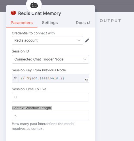 {{ $json.sessionId }}라는 표현식은 '이전 노드에서 들어온 JSON 데이터($json)의 sessionId라는 키 값을 사용하겠다'는 의미이다. - Session Time To Live: 대화 기록을 Redis에 얼마 동안 보관할지 초 단위로 설정한다. `0`으로 설정하면 만료 시간 없이 영구적으로 저장된다.