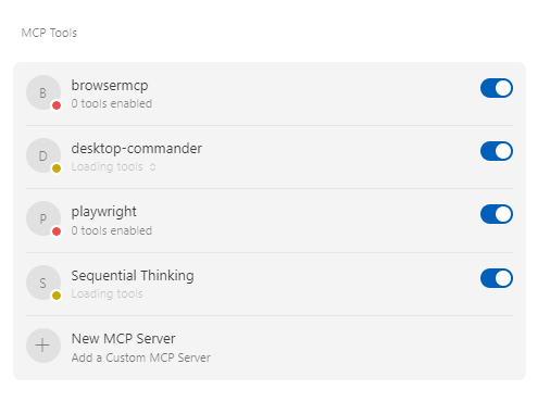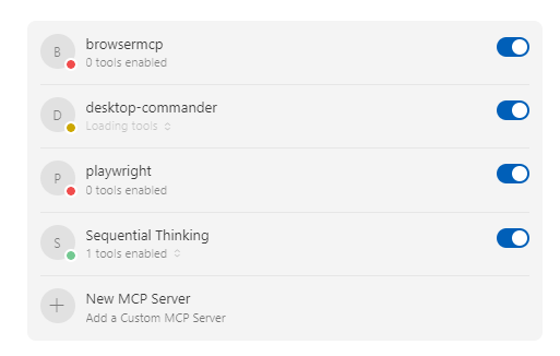 - 설치된 서버 목록에 "openrouterai"와 "server-sequential-thinking"이 보일 것이다. 하지만 처음에는 아래 이미지와 같이 회색 글씨의 'Disabled' 상태일 것이다.